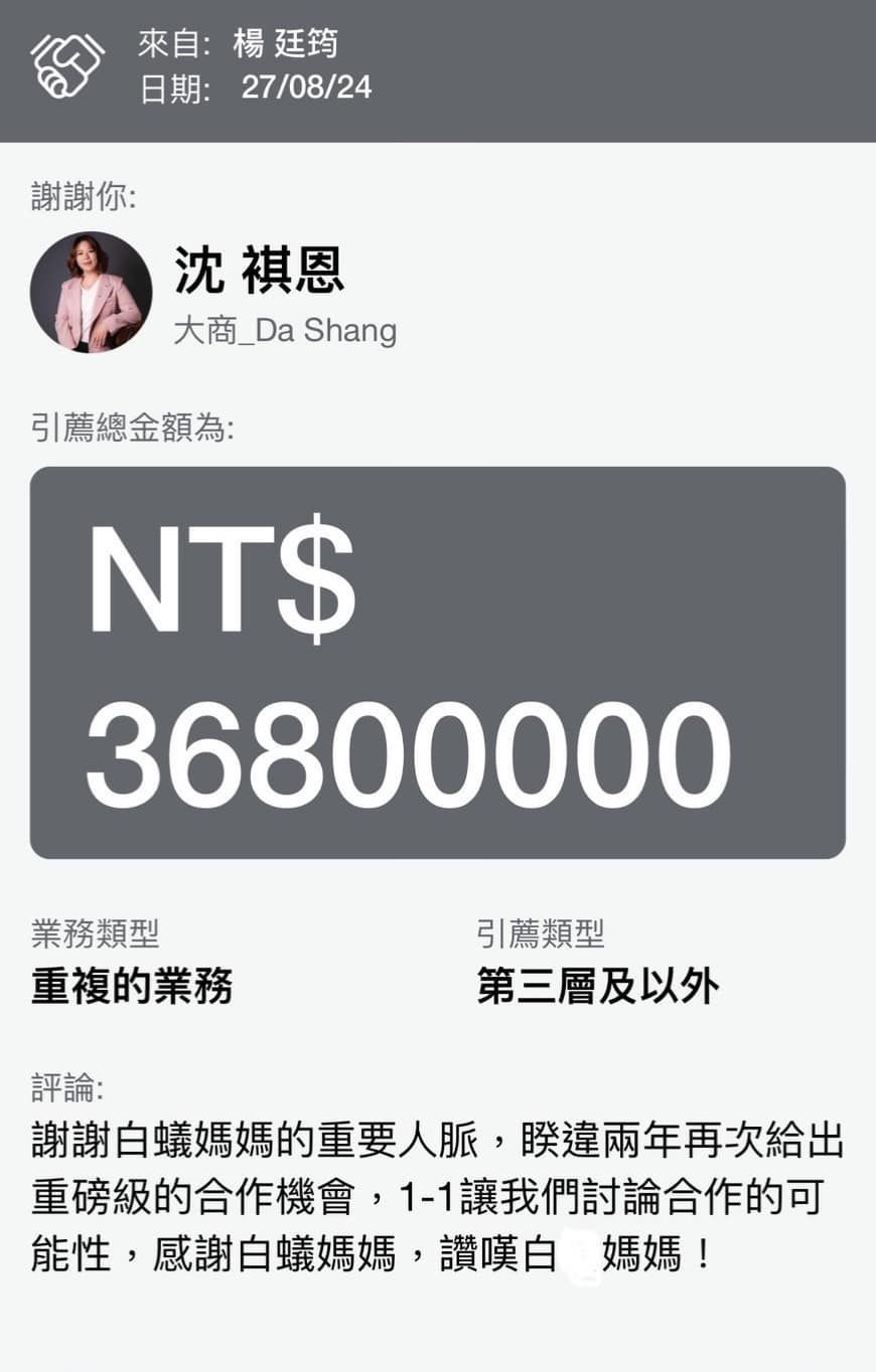 兩年前,白蟻媽媽成功引薦廷筠給一間美商公司,促成了近500萬的成交額!更讓人振奮的是,今年白蟻媽媽再次介紹了一家科學園區內的新廠房公司,半年後,廷筠順利簽下了3680萬的合約!