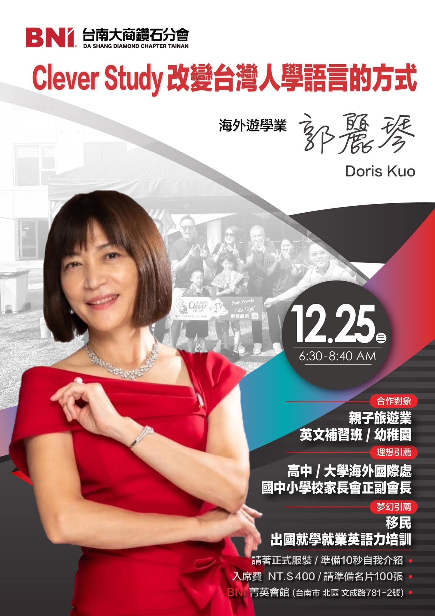 12/25(三) 是海外遊學業郭麗琴 Doris的主題簡報日,她將分享如何透過實地體驗改變學習模式,讓每位參與者都能自信說英語,迎接未來挑戰!