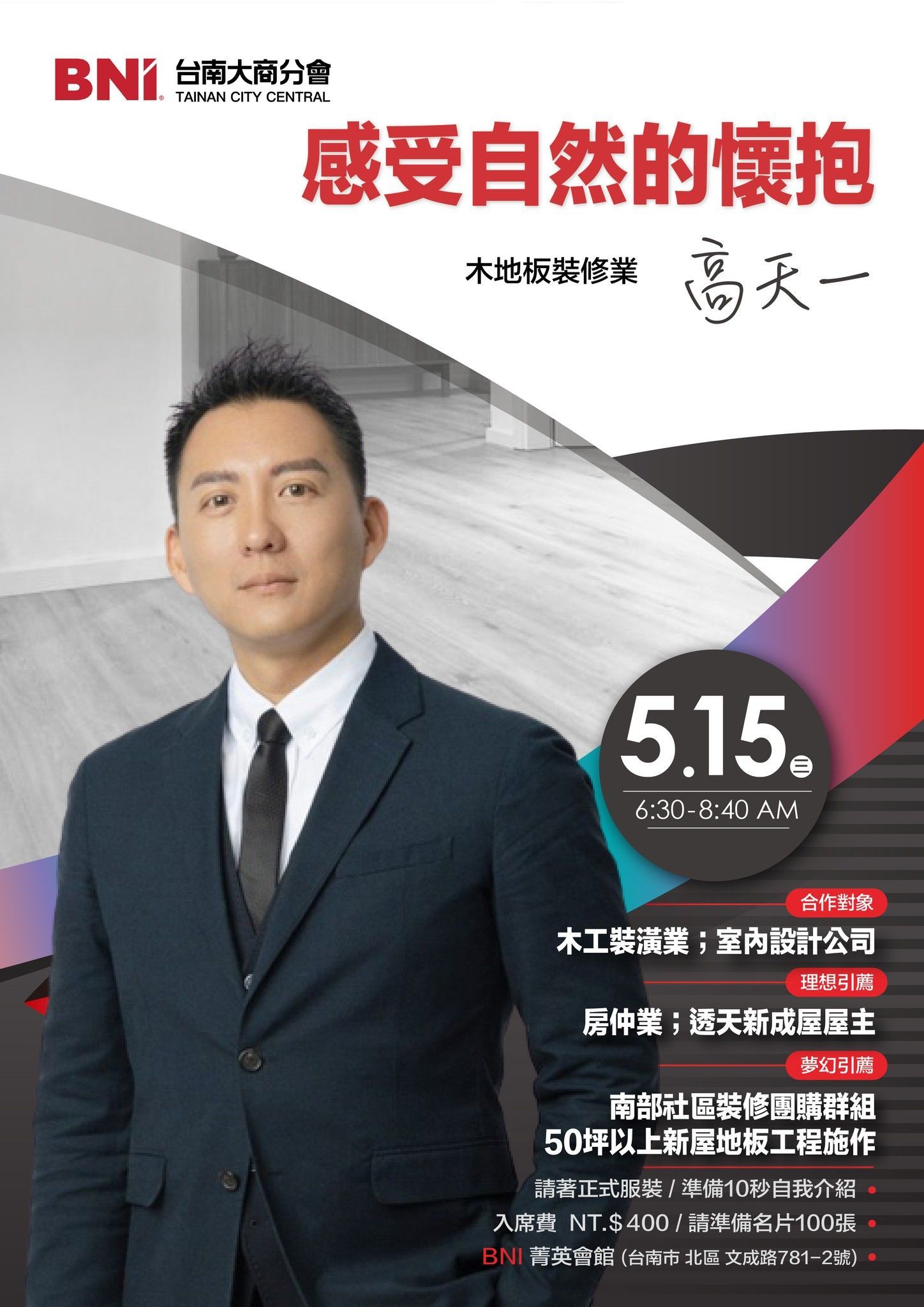 全都不認識沒關係,5/15(三)BNI台南大商分會很榮幸邀請地下里長、喊水會結凍、AKA東區王陽明木地板裝修天下第一的高天一來為我們做主題簡報。