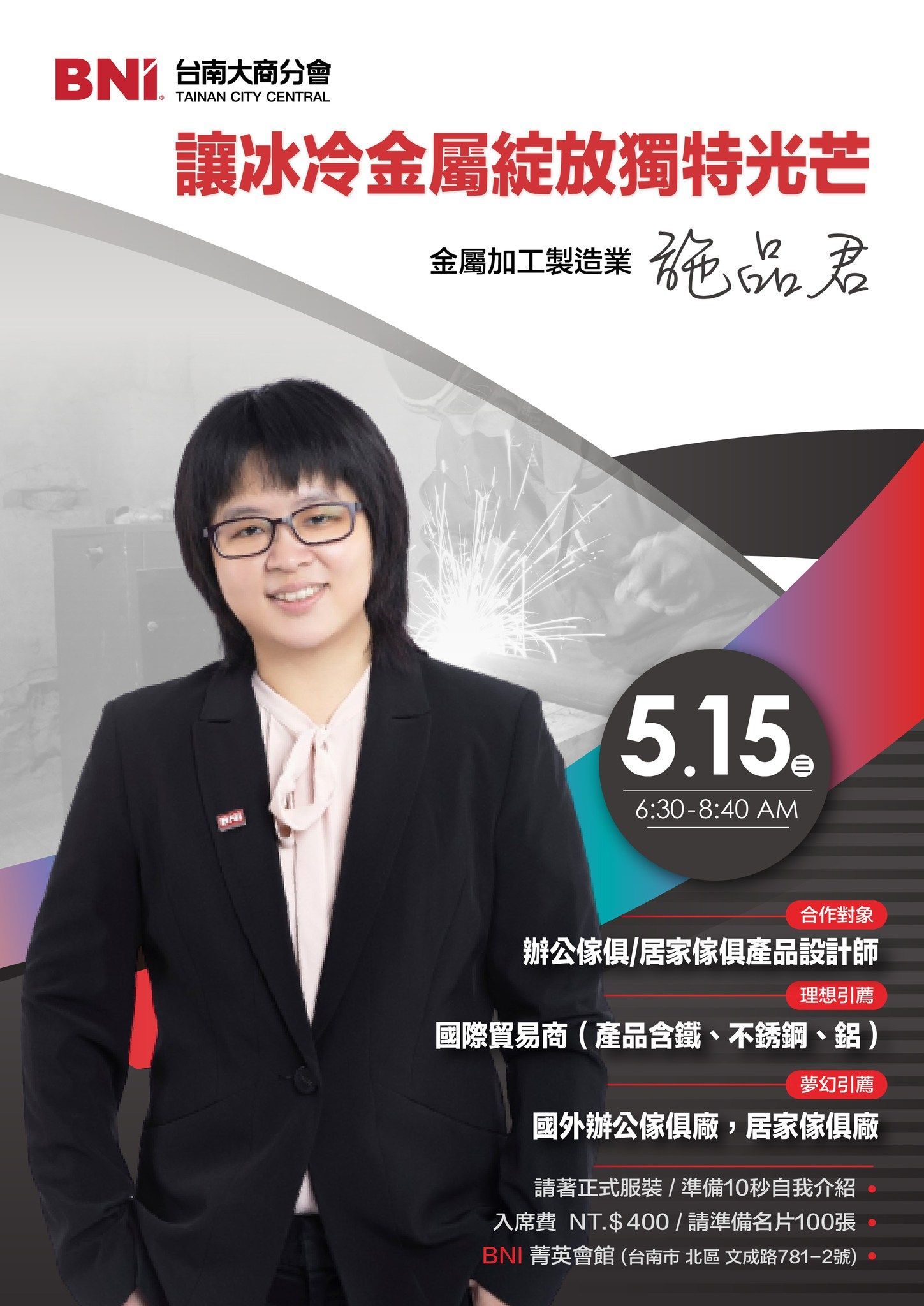 5/15(三)慧同企業有限公司經理品君,將會為我們帶來一場精采的金屬加工製造業的主題簡報, 誠摯邀請國內外傢俱製造商、 外銷醫療器材製造商、 外銷運動用品製造商,以及對金屬加工製造業有興趣的您一起來聆聽。