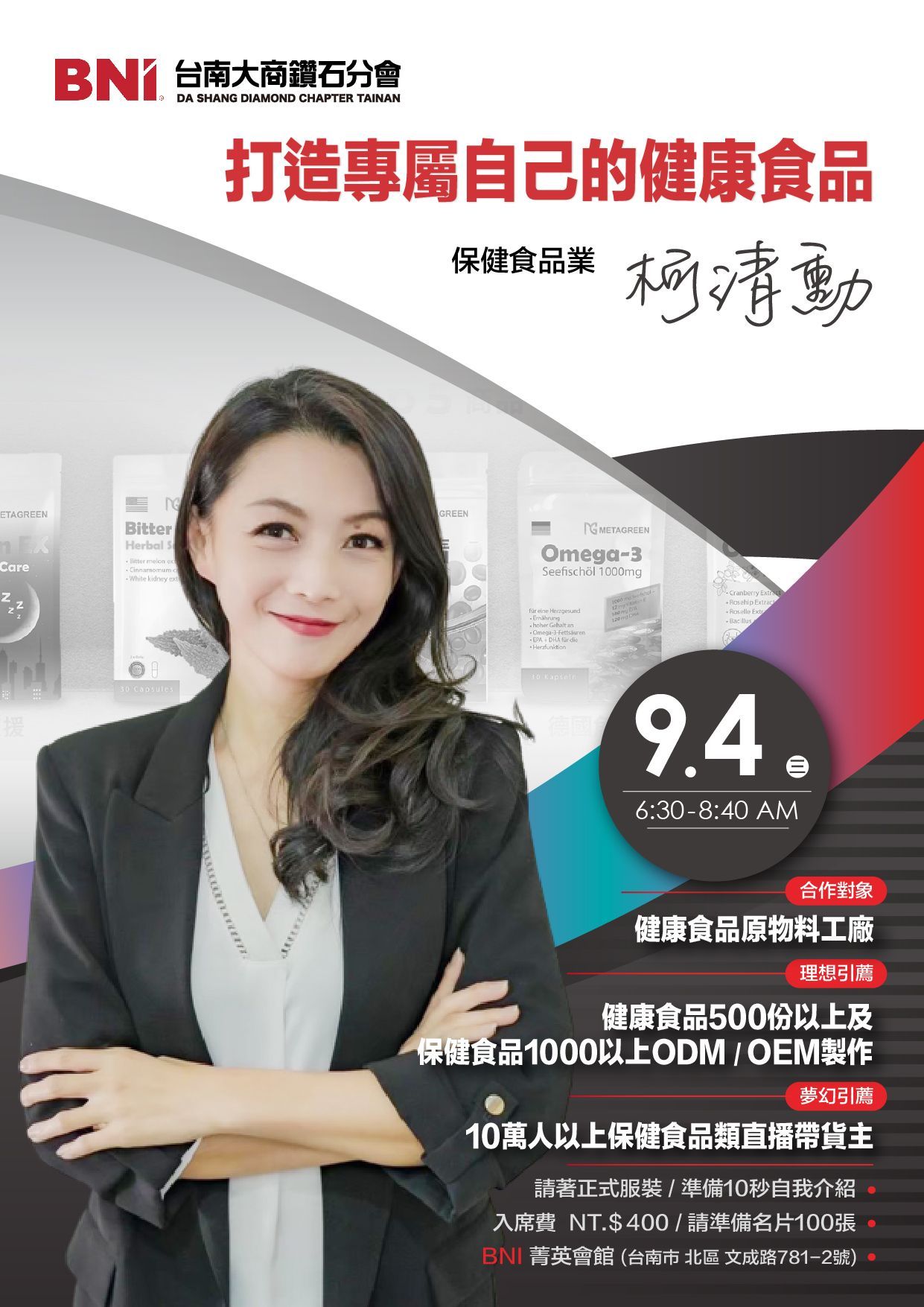 公司旗下有近百種產品,主打三高一低:高品質、高濃度、高體感以低負擔的準則,給予您全面性的照顧。無論是想開創新商品的生技專業人士、網紅、團購主或是想建立自有品牌的企業主,9/4(三)是KELLY的專題簡報日,邀請您一起來聆聽,如何自創專屬自己的保健食品品牌,並打造專屬於您的健康王國。