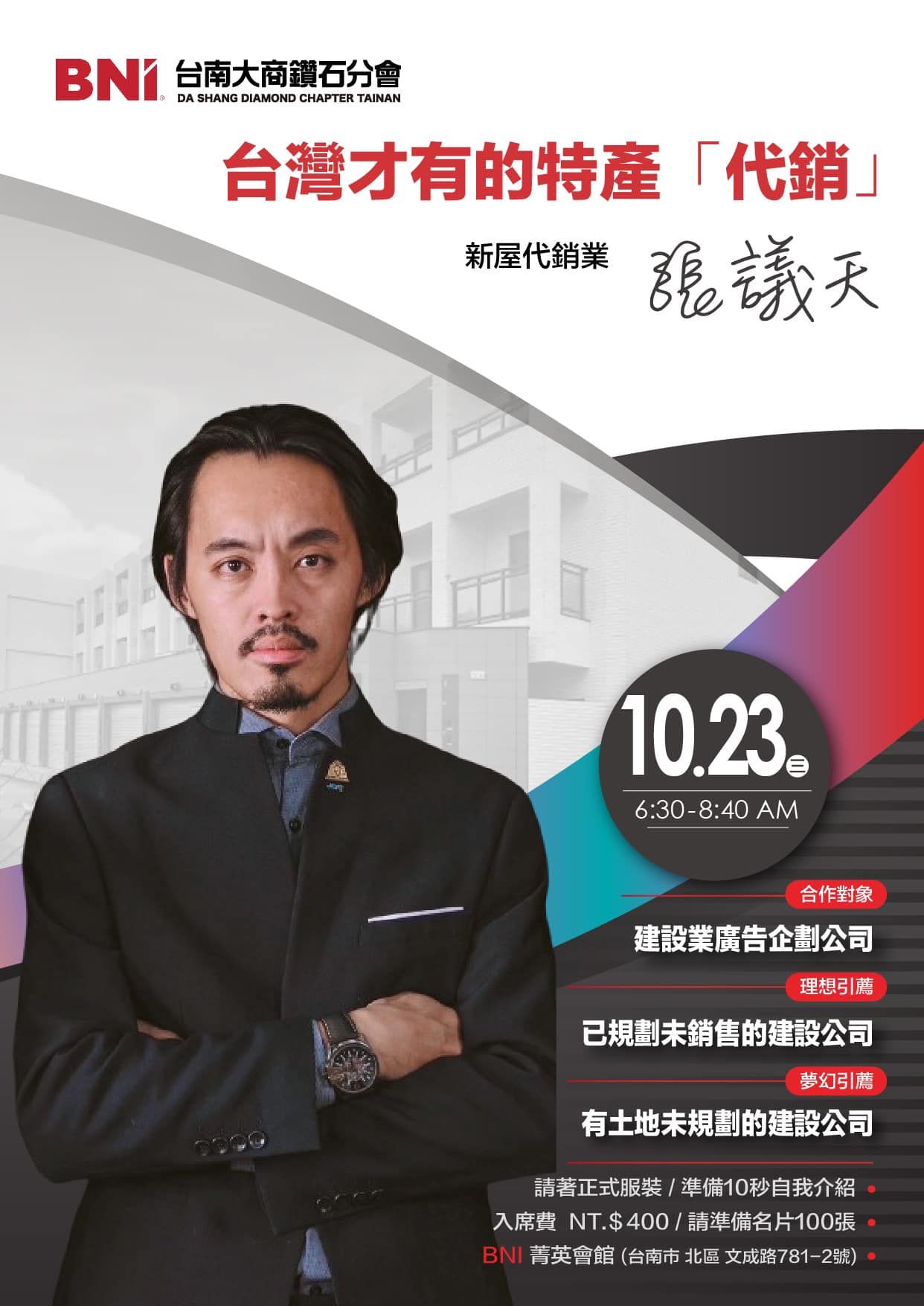 10月23日(三)是征星行銷的張議天主題簡報日長腿帥哥議天的獨家分享,保證讓您收穫滿滿掌握代銷成功的關鍵!