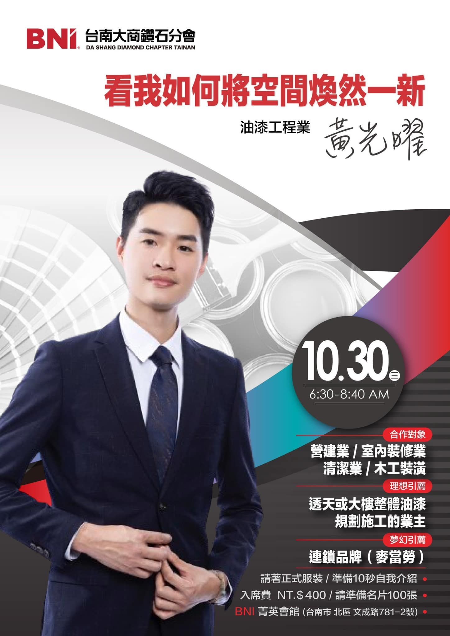 10月30日(三) 是油漆工程業代表黃光曜主題簡報日油漆歐巴將帶您瞭解油漆塗料的相關知識,幫助大家在規劃裝修時,面對琳琅滿目的塗料能快速找到方向並掌握使用油漆裝潢的小訣竅!