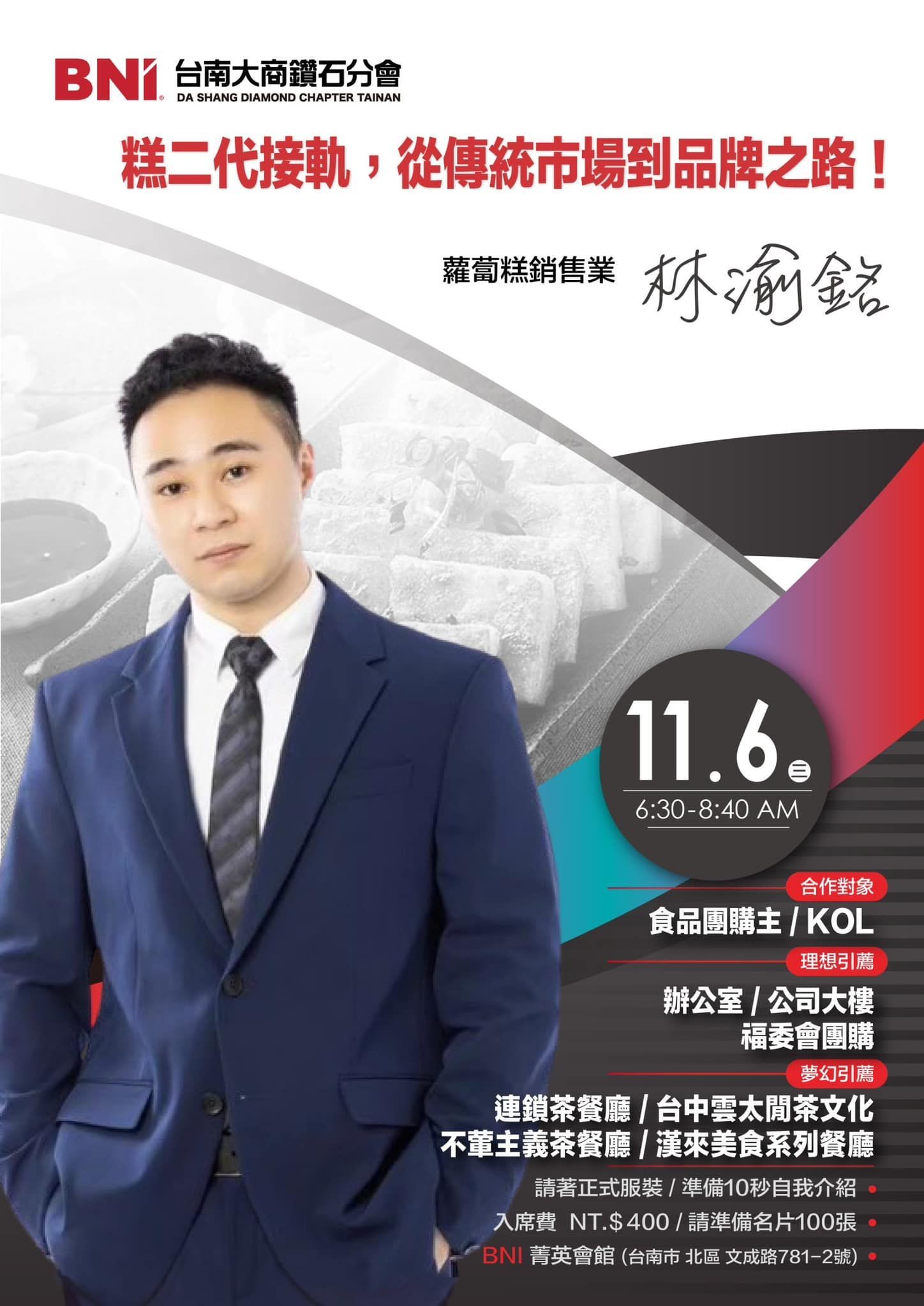 11/06(三)是蘿蔔糕銷售業林渝銘的主題簡報日。帥氣的蘿蔔糕專家渝銘,將分享從傳統市場、代工歷經疫情到網路品牌之路以及如何在經典與創意間取得平衡,打造出獨具特色的蘿蔔糕品牌!
